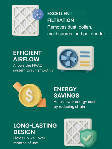 MERV 11–13 filters remove up to 95% of dust, pollen, mold, and pet dander.